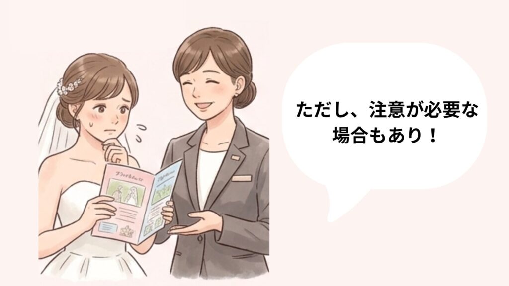 ブライダルフェアでは、1件目特典や当日契約特典など、魅力的に見えるキャンペーンが用意されていることはブライダルフェア1件目の特典とは?で説明しましたが、特典だけで式場を決めてしまうと、あとから後悔するケースもあります。