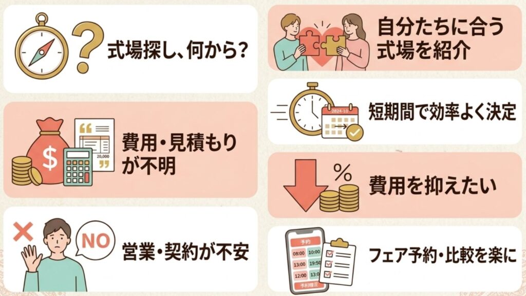 この電話の目的は、営業や勧誘というよりも、以下のような式場探しをスムーズに進めるためのサポートが中心です。