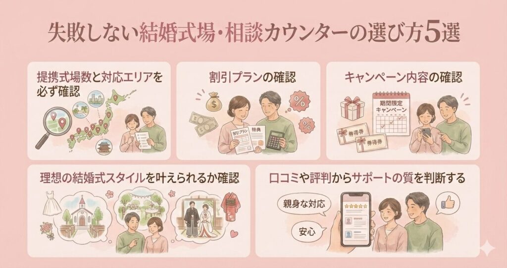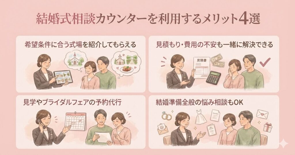 結婚式場相談カウンターには、それぞれ異なる特徴があります。まずは自分が何を重視したいのかを明確にしたうえで、サービスを選びましょう。