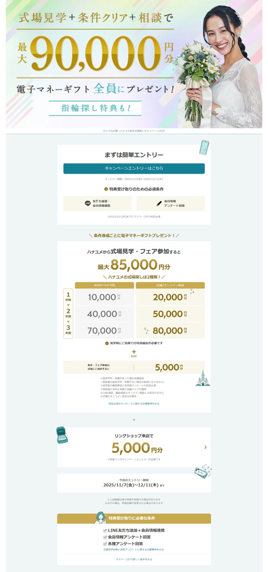 キャンペーン特典電子マネーやギフト券プレゼント衣装・装花・演出などがセットで割安