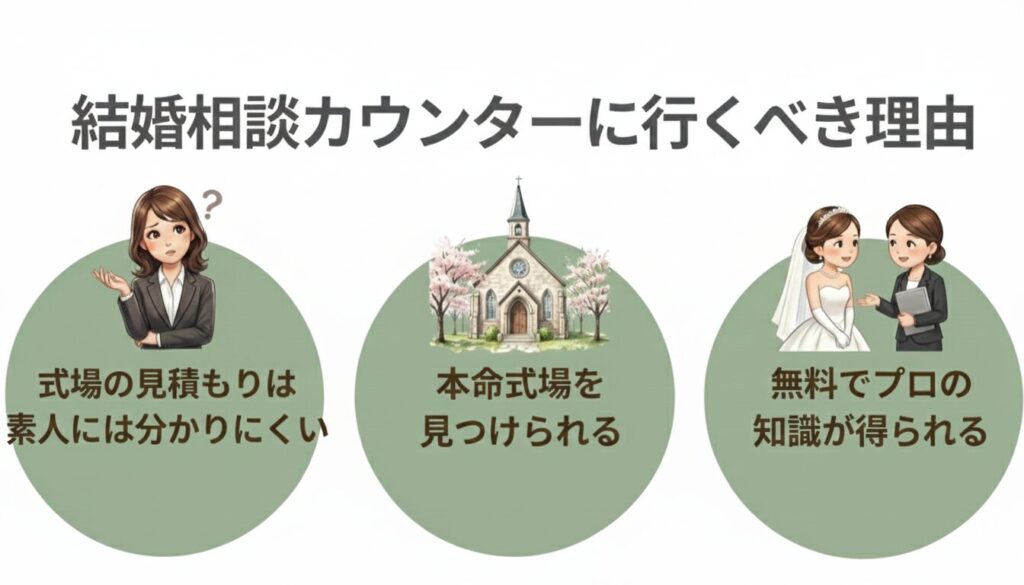 結婚式相談カウンターは、「結婚式が初めての人」が一番得をするサービスです。行かなくても式場探しはできますが、行くことで得られる知識・割引・安心の差は圧倒的。