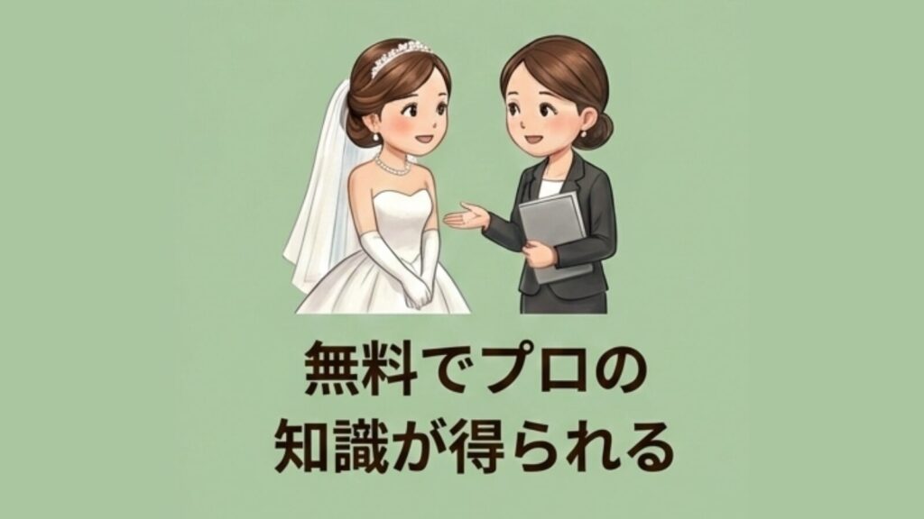 一番の魅力は、プロの知識を完全無料で得られること。相談カウンターは式場からの紹介料で運営されているため、利用者は一切料金を払う必要がありません。